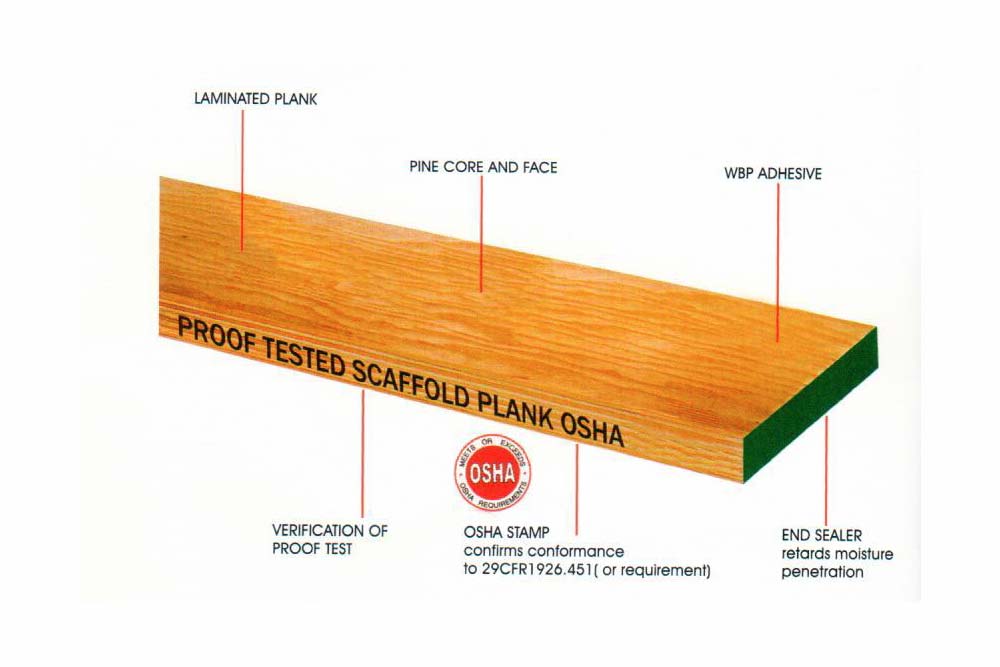 LVL OSHA LVL Planks shall measure 38mm thick by 225mm wide and are embossed “PROOF TESTED SCAFFOLD PLANK” and “OSHA”. They are treated in accordance with BS5973 or equivalent standards.